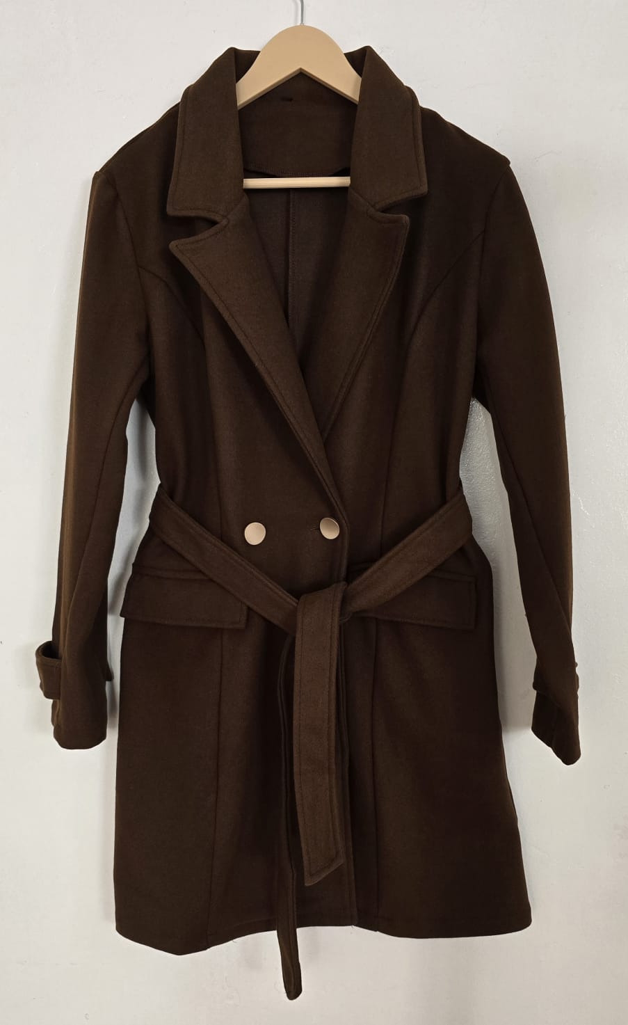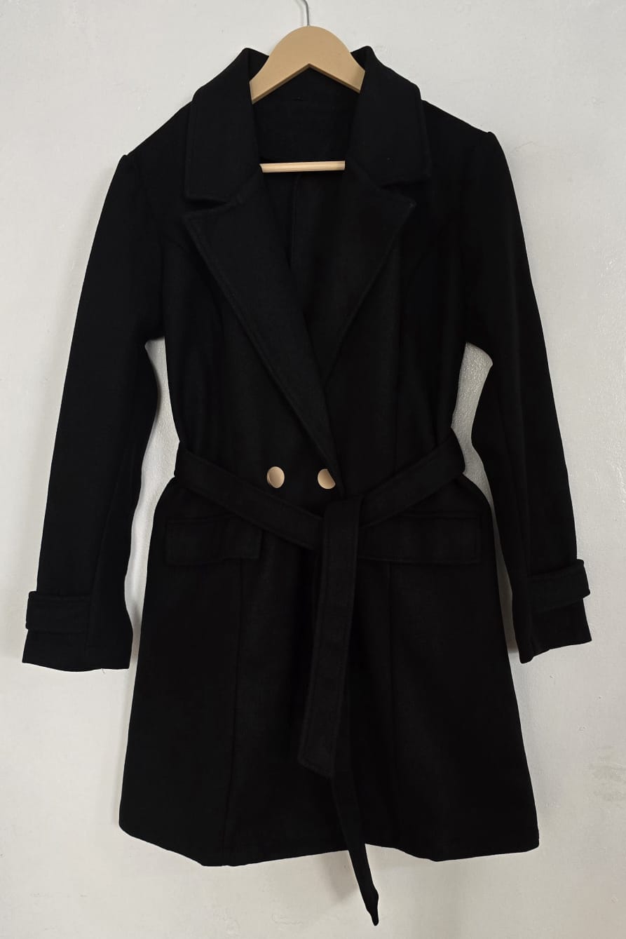Abrigo de mujer confeccionado en paño, ideal para complementar tus looks en los días fríos con un estilo elegante y moderno. Su diseño clásico con dos botones frontales y bolsillos laterales lo convierte en una prenda práctica y estilosa al mismo tiempo.