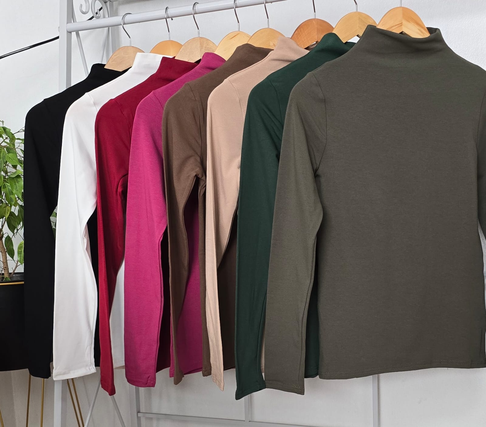 Polera de mujer con cuello alto confeccionada en tela algodón con spandex, suave, cómoda y elasticada. Ideal para usar en días fríos o como prenda básica para combinar con distintos outfits.
